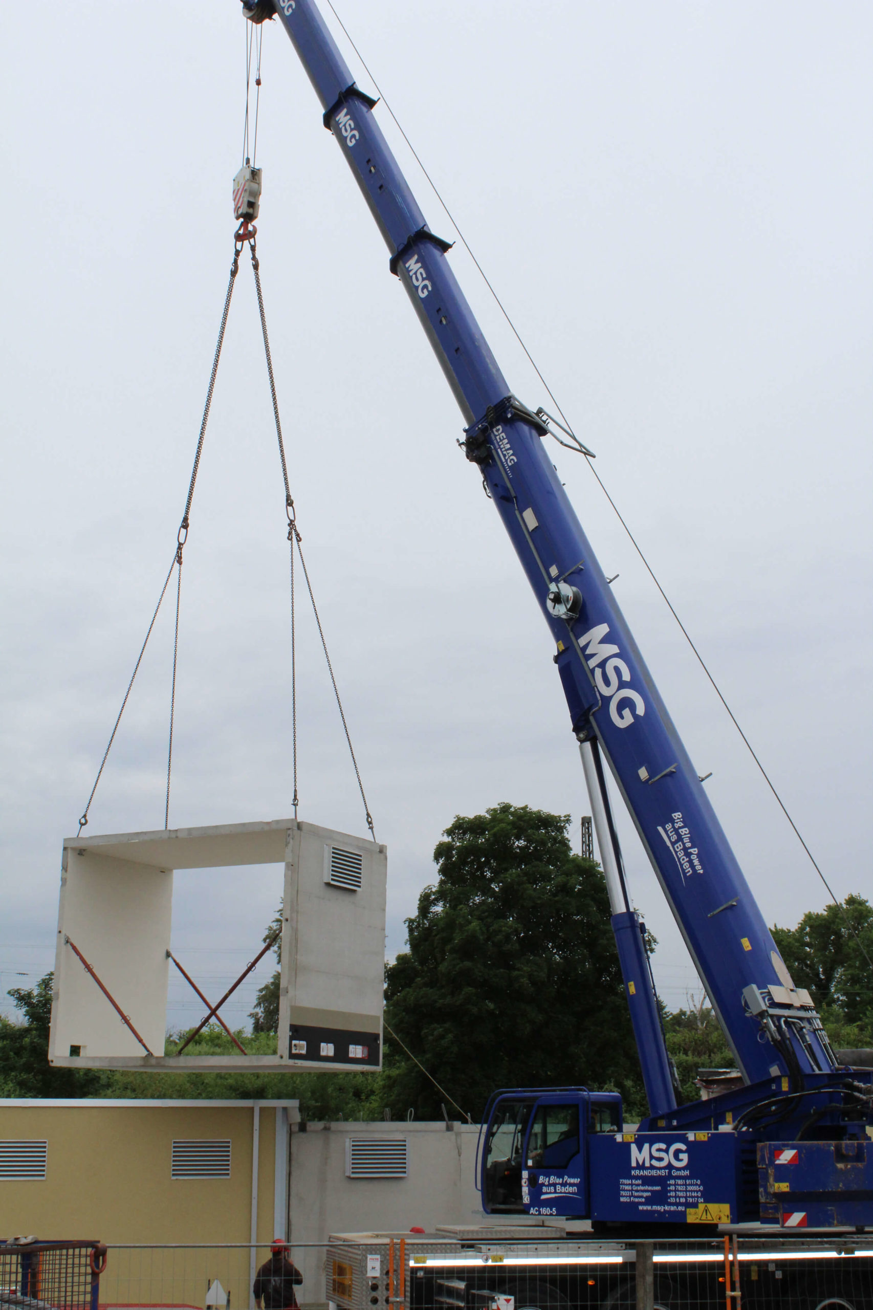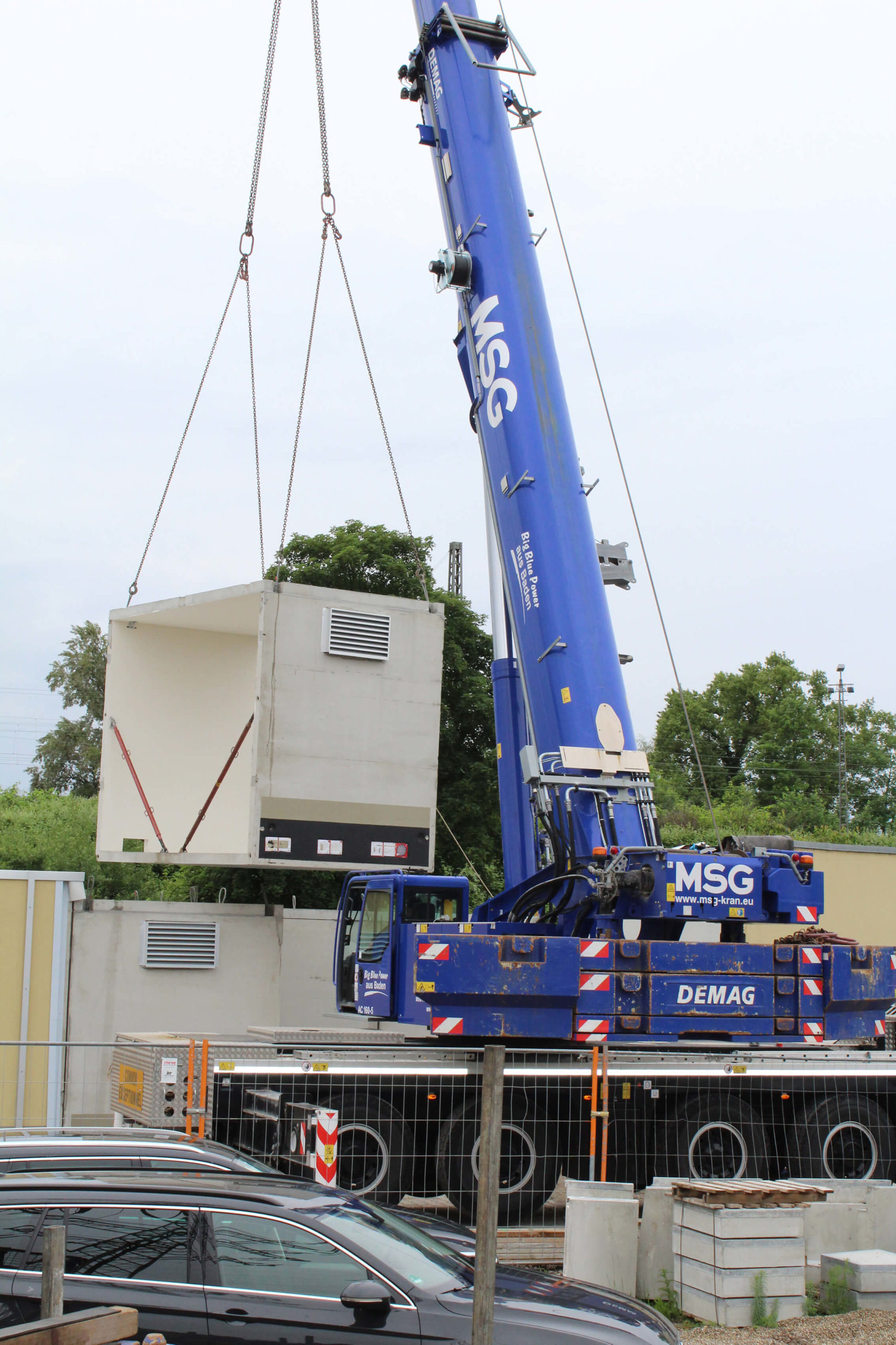 Unser blauer Terex -Demag AC 160-5 hat bei dem Einheben der Betonstation präzise Arbeit geleistet.