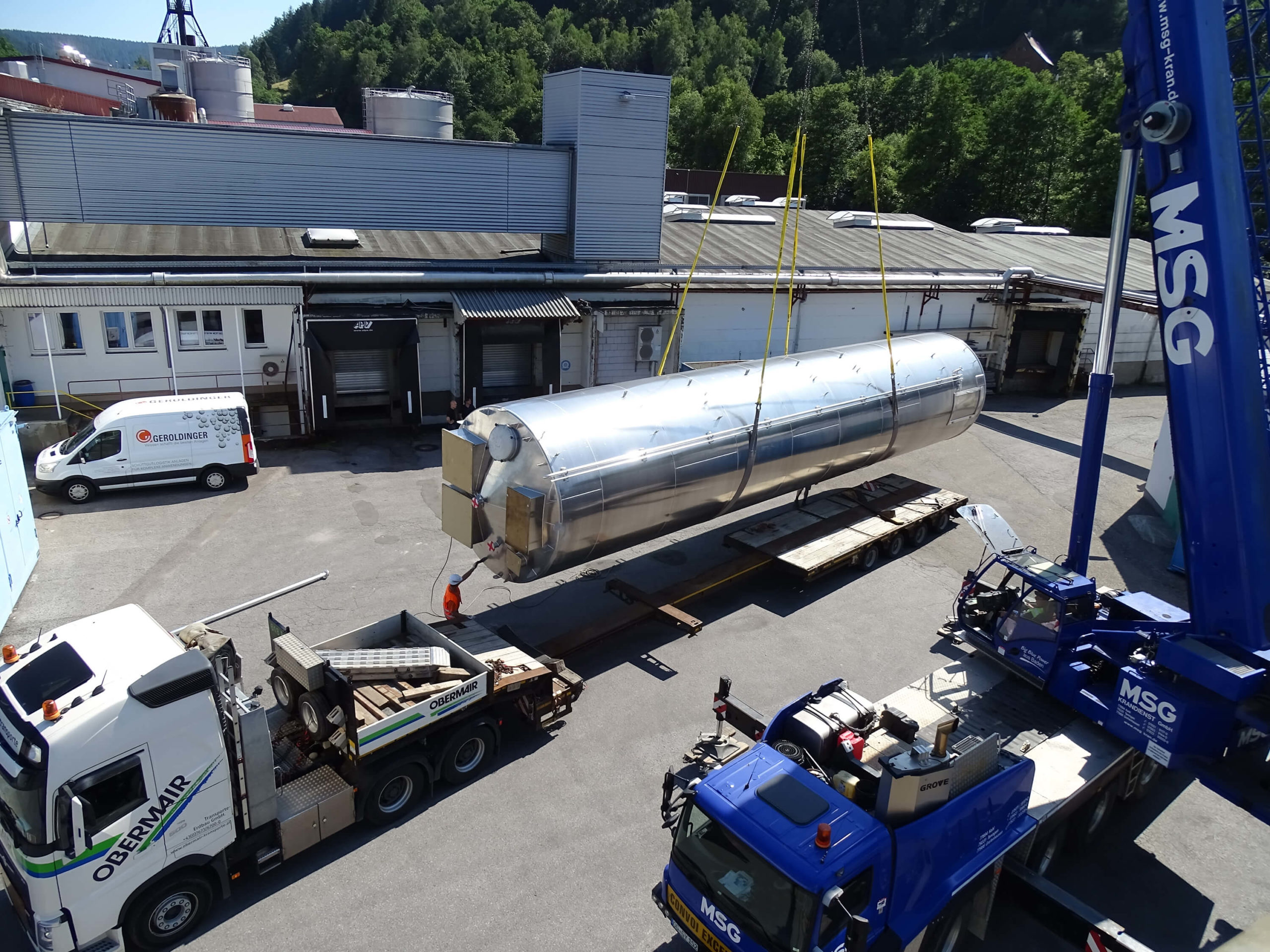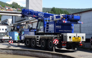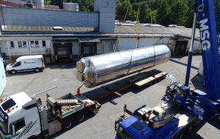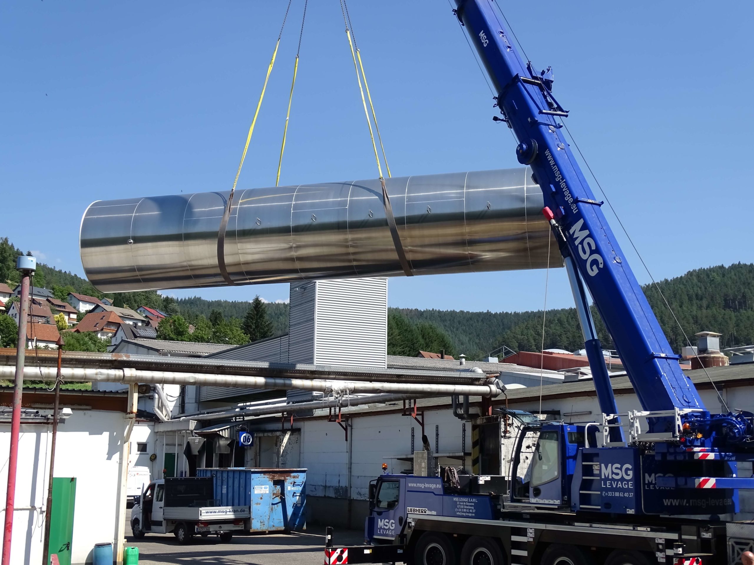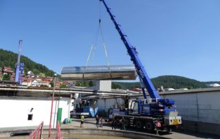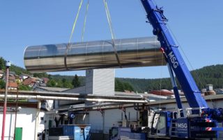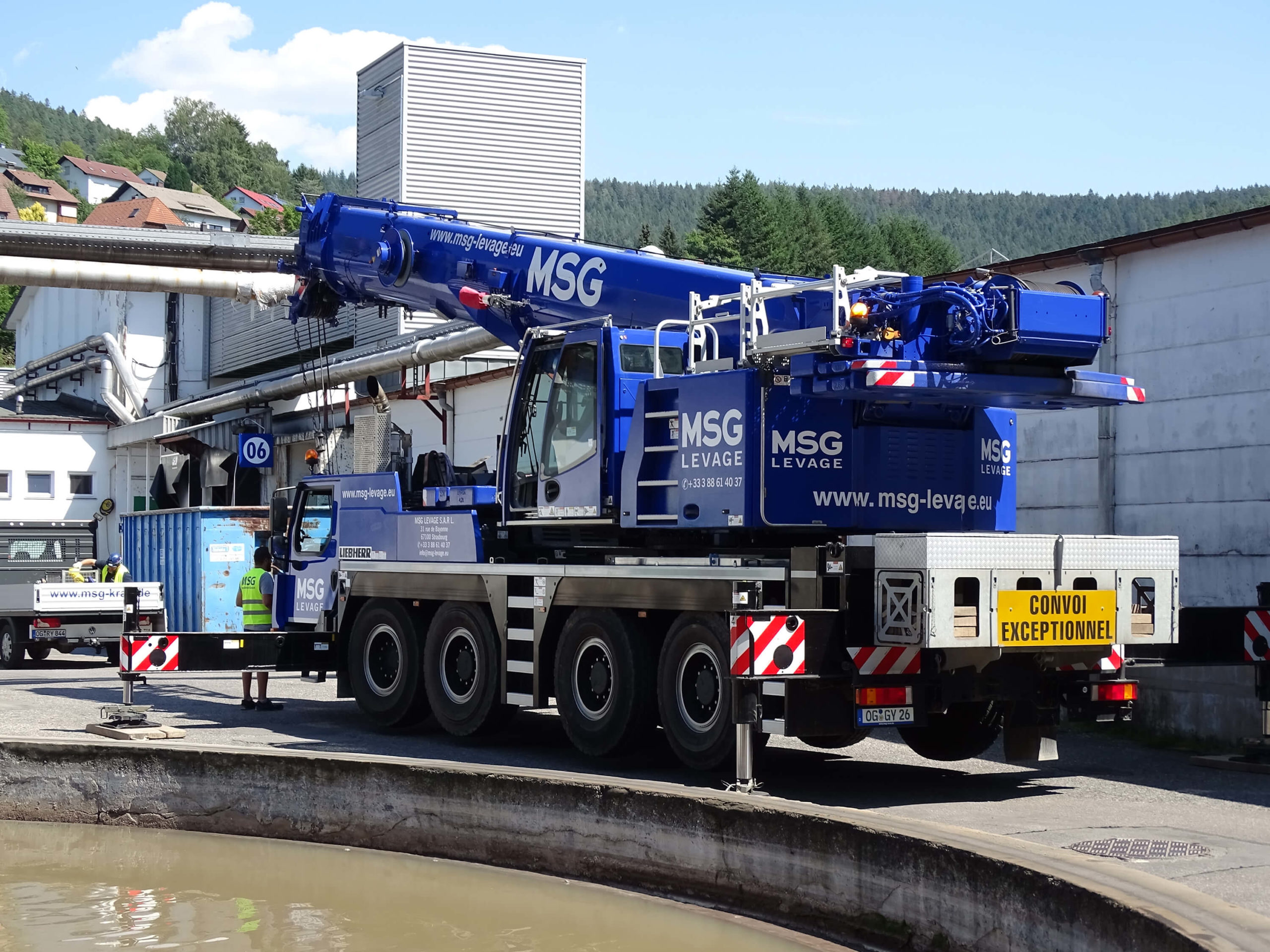 Notre Liebherr LTM 1090 équipée du Variobase a déchargé le silo de 3,5M de diamètre et longueur de 17,8M pour un poids de 4,5T dont les dimensions ne permettait pas à la mise en place directe.