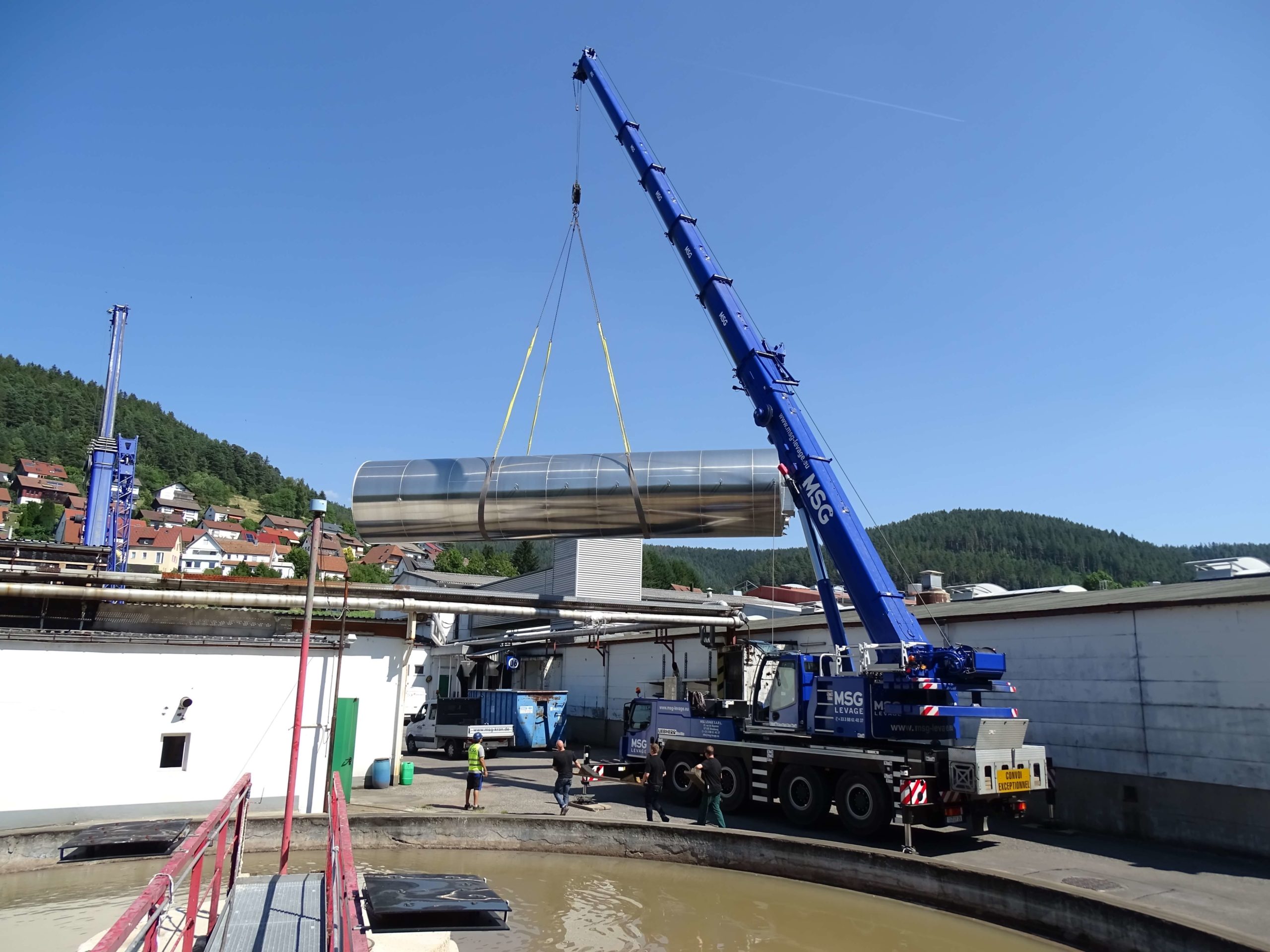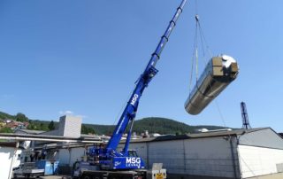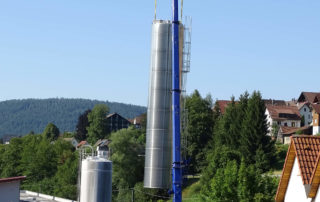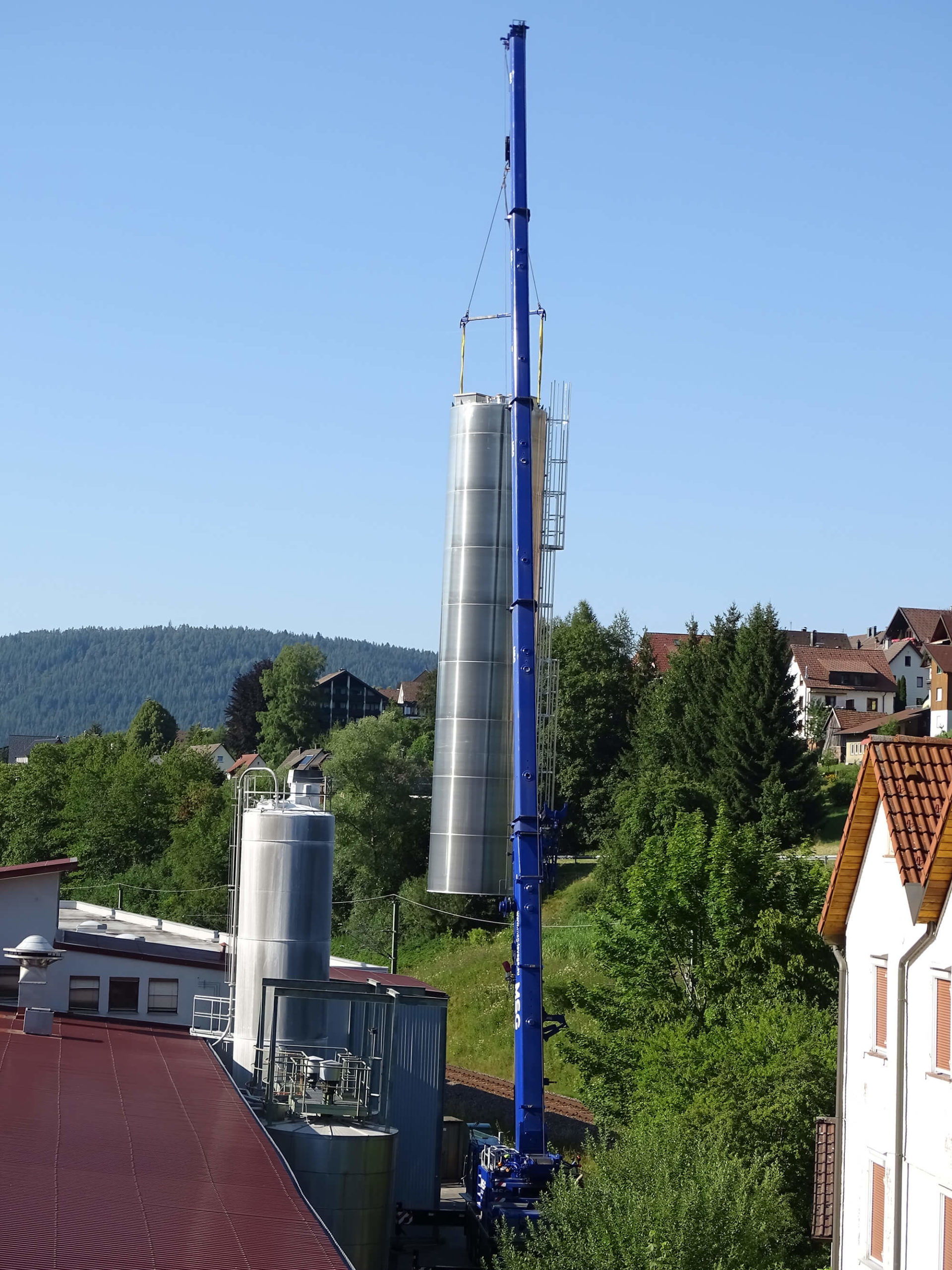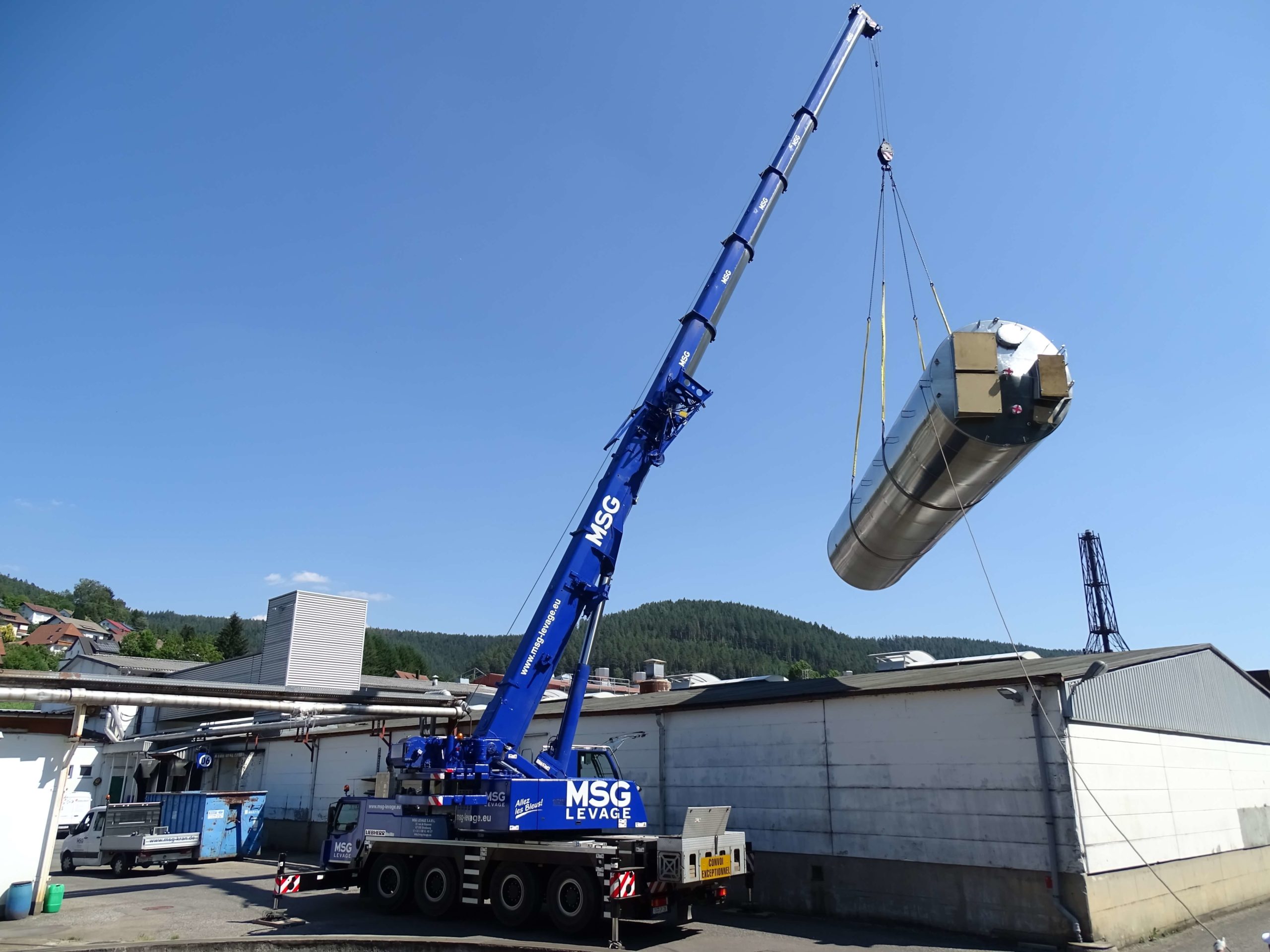 Levage en tandem par notre Liebherr LTM 1090-4.1. La mise en place du silo a nénessité l’utilisation d’un palonnier .