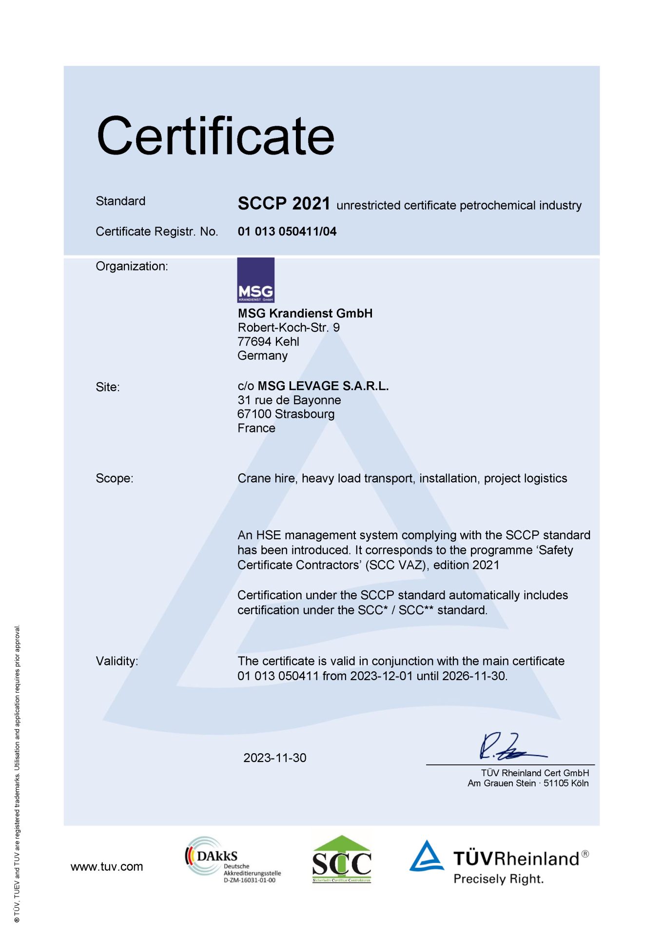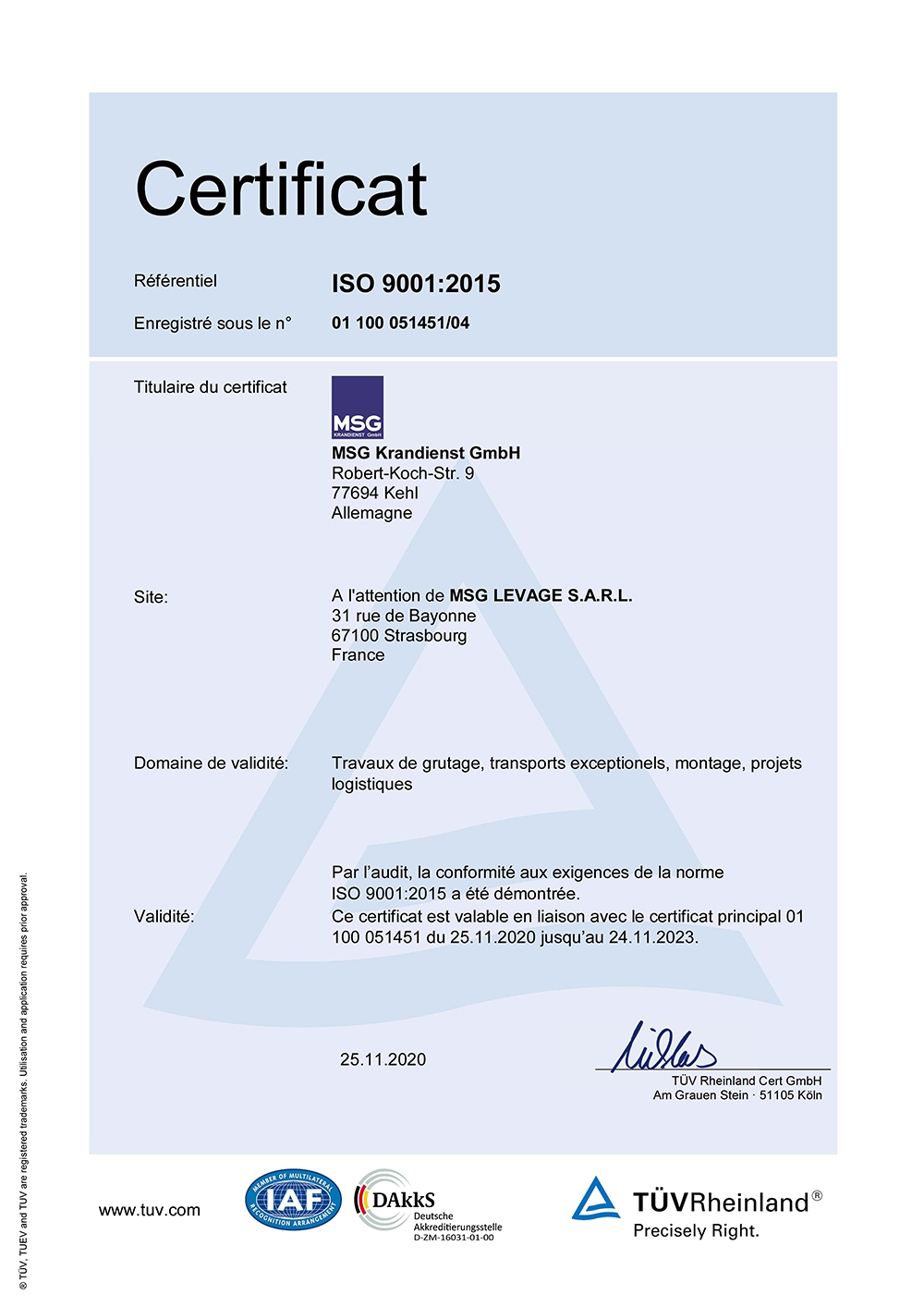 Pour ce faire, la direction elle-même et chacun des employés, s’engagent á respecter les exigences des normes DIN EN ISO 9001:2015 et SCC Version 2021 conformément á notre politique de management et á veiller á éviter les accidents, les risques sanitaires et les risques de pollution.